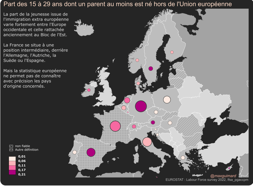 La cartographie de l’Europe que les données de la seconde génération font apparaître ne surprend guère. L’impact pluri générationnel de l’immigration extra européenne sur la tranche d’âge de 15 à 29 ans est plus fort en Europe de l’Ouest que dans les pays appartenant anciennement au Bloc de l’Est. La France s’insère à un rang moyen en ce qui concerne les origines extra UE (15%), et même bas en ce qui concerne les origines intra UE (2%).