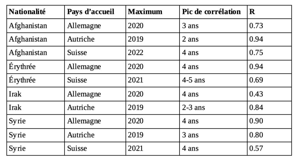 Pour cette raison, il semble utile d’étudier le décalage dans le temps et l’intensité de la relation entre les vagues de protection puis de retrait, par nationalité et selon les pays d’accueil. Il paraîtrait normal que cette distance varie en fonction des nationalités, puisqu’un retrait de protection est normalement motivé par la situation sécuritaire dans le pays d’origine. Les pics de retraits pour une même nationalité devraient donc aussi intervenir au même moment dans les différents pays d’accueil.